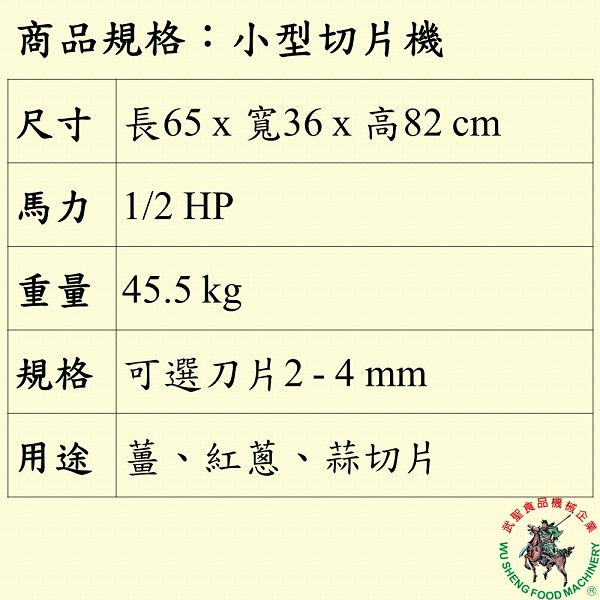 尺寸:長65 x 寬36 x 高82 cm 馬力:1/2 HP 重量:45.5 kg 規格:可選刀片2 – 4 mm 用途:薑、紅蔥、蒜切片