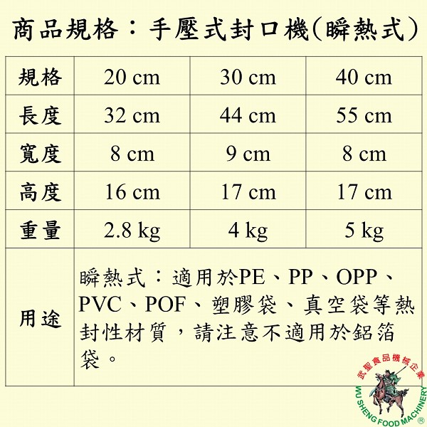 另有手壓封口機(直熱式)販售,適用於較厚的袋子