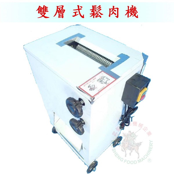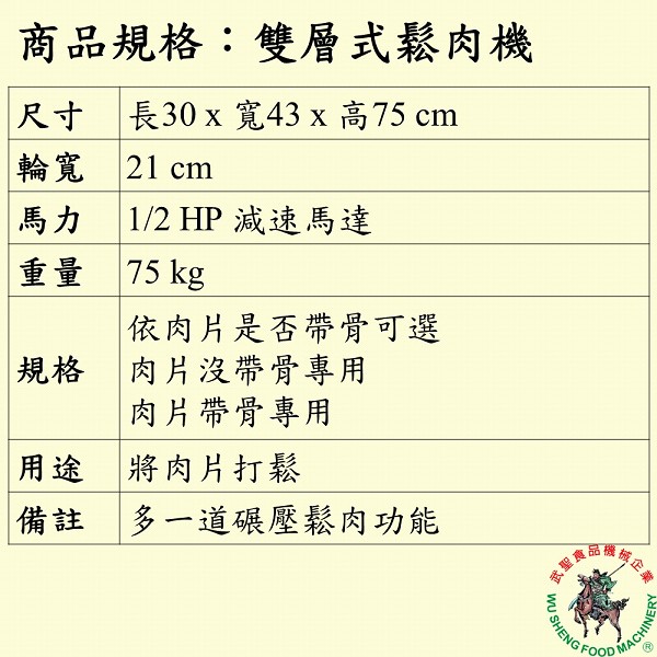 尺寸:長30 x 寬43 x 高75 cm 輪寬:21 cm 馬力:1/2 HP 減速馬達 重量:75 kg 用途:將肉片打鬆 備註:多一道碾壓鬆肉功能